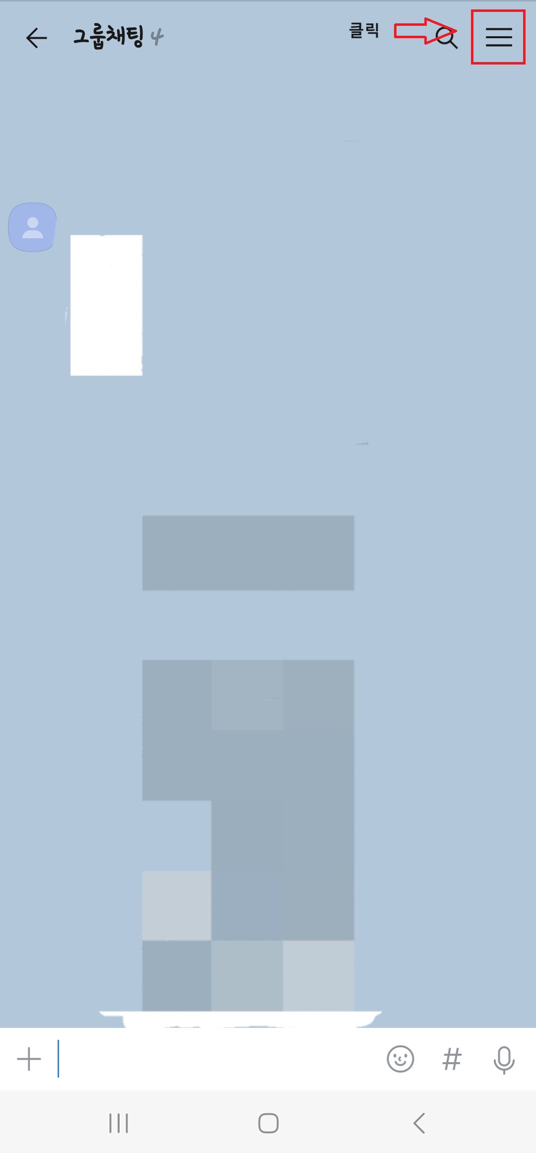 조용히 나가고 싶은 카카오톡 단톡방으로 들어가서 오른쪽 위에 빨간 박스로 표시한 가로줄 세개 버튼을 클릭해 주세요.