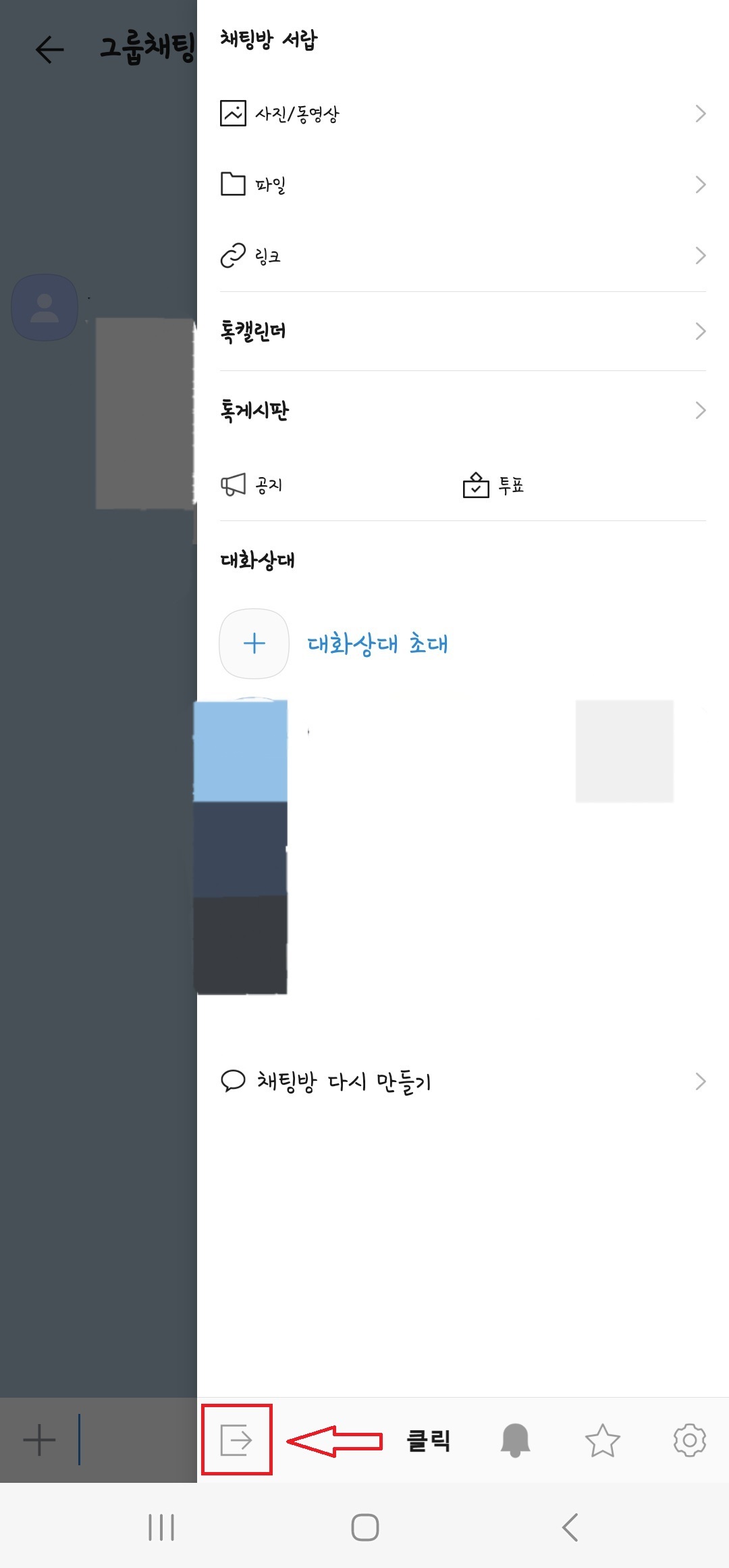 가로줄 세개 버튼을 클릭하셨다면 채팅방 서랍 메뉴가 나오는데요. 하단 빨간 박스로 표시한 화살표 모양 나가기 버튼을 클릭해 주세요.