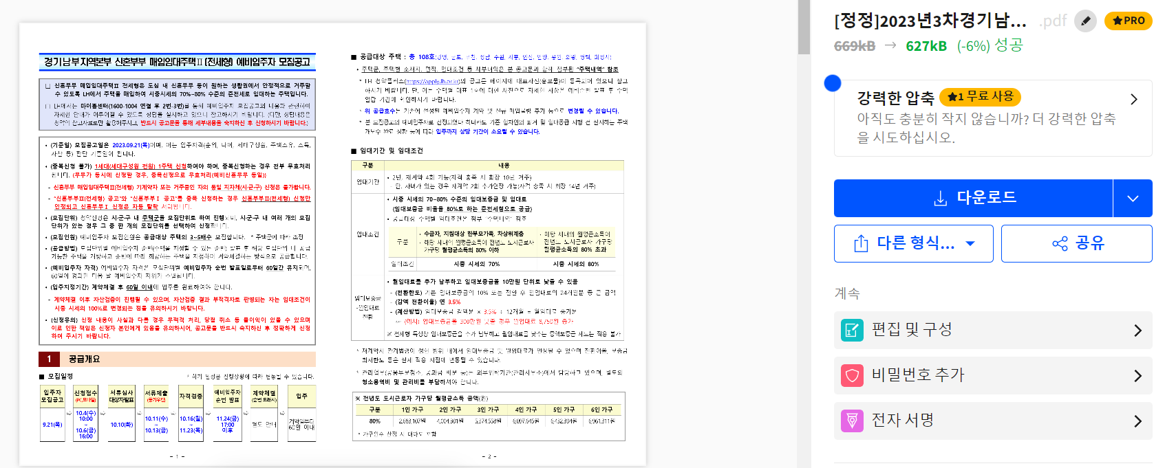 오른쪽 파란색 다운로드 버튼을 눌러 pdf 용량 줄이기를 한 파일을 다운받아 주세요.