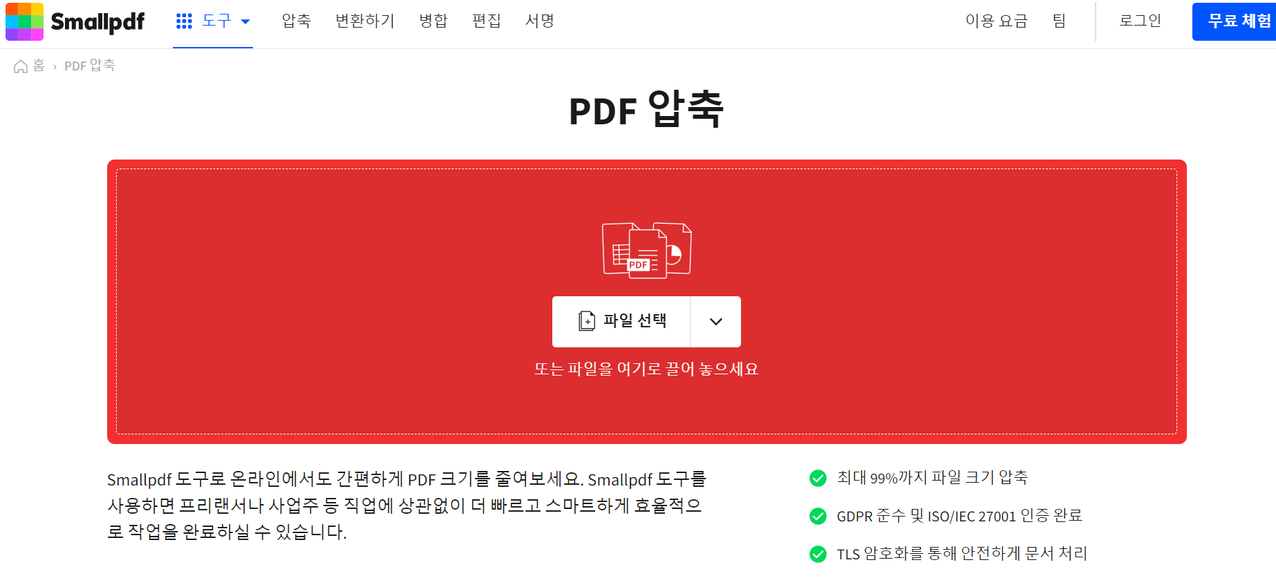 여기까지 pdf 용량 줄이기 방법을 알아보았습니다. 공유나 업로드 할 때 파일 용량 제한이 있을 때 pdf 용량 줄이기를 사용할 수 있습니다. pdf 용량 줄일 수 있는 사이트인 Smallpdf, Allinpdf 사이트에서 pdf의 용량을 줄일 수 있습니다. 업로드할 때 문서 보안이 걱정되실 수 있으신데요. Smallpdf에서는 모든 정보 전송을 256비트 TLS 암호화를 사용하여 전송하고 있습니다. 그리고 보안 표준 ISO/IEC 27001, GDPR, CCPR을 준수하고 있어 문서 보안에 대한 보호 조치도 하고 있습니다.