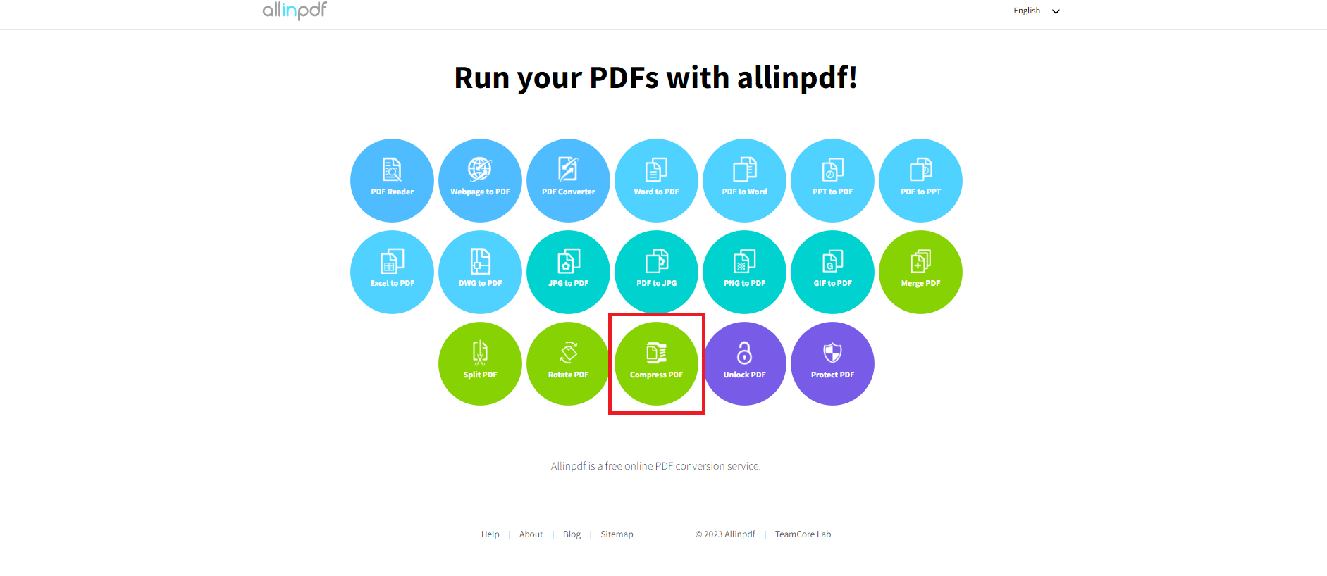 위 사진은 아래 링크를 통해 이동하면 나오는 allinpdf 사이트입니다. 아래 링크를 통해서 홈페이지 화면으로 이동해 주세요. 이동하셨으면 빨간색 네모로 표시한 Compress PDF 버튼을 클릭해서 pdf 용량 줄이기 화면으로 이동합니다.