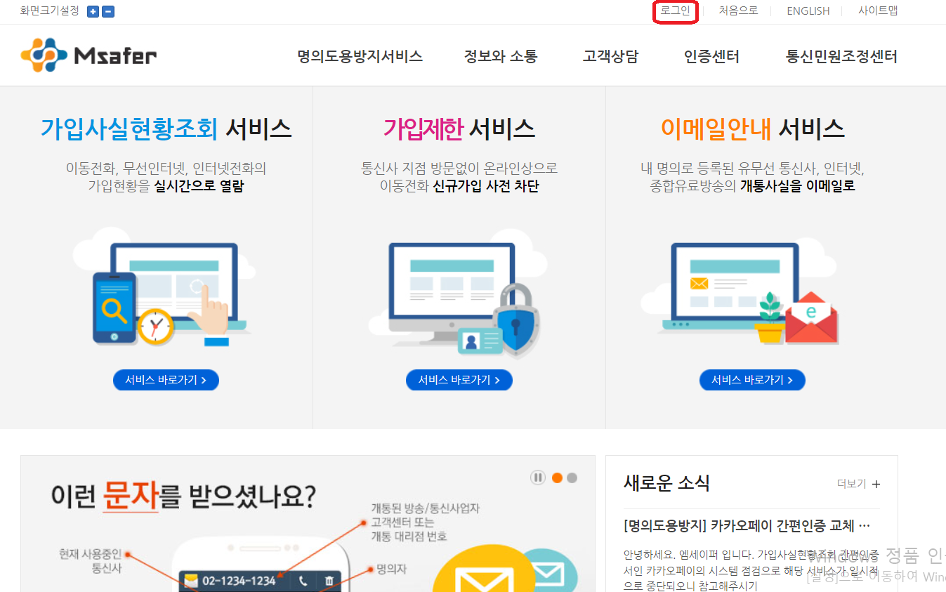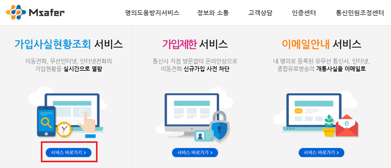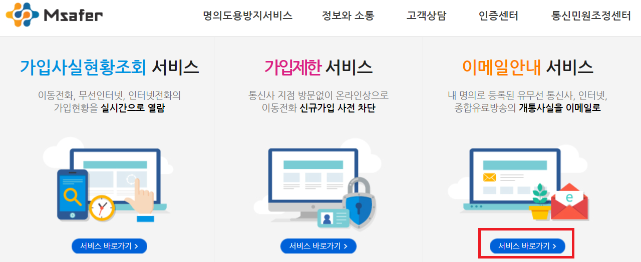 본인 명의로 신규 가입 또는 명의 변경 시 그 사실을 이메일로 알려주는 서비스입니다. 위 서비스도 공동인증서로 로그인할 경우에만 사용할 수 있습니다. 엠세이퍼 홈페이지 첫 화면에서 위 빨간 박스로 들어가주세요.