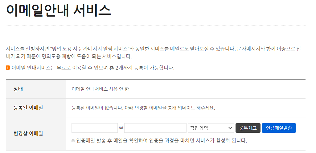 클릭하시면 엠세이퍼 홈페이지에서 위 화면으로 넘어갑니다. 변경할 이메일 입력 후 중복체크, 인증 메일 확인을 하여 신청합니다. 인증메일 발송 후 메일 확인 시 이메일 안내 서비스가 활성화됩니다.