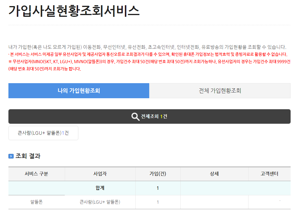 위와 같이 엠세이퍼 가입사실현황조회서비스 화면이 뜹니다. 저는 알뜰폰 큰사람(LGU+ 알뜰폰)을 가입하여 쓰고 있어서 알뜰폰 가입 1건이 조회됩니다.