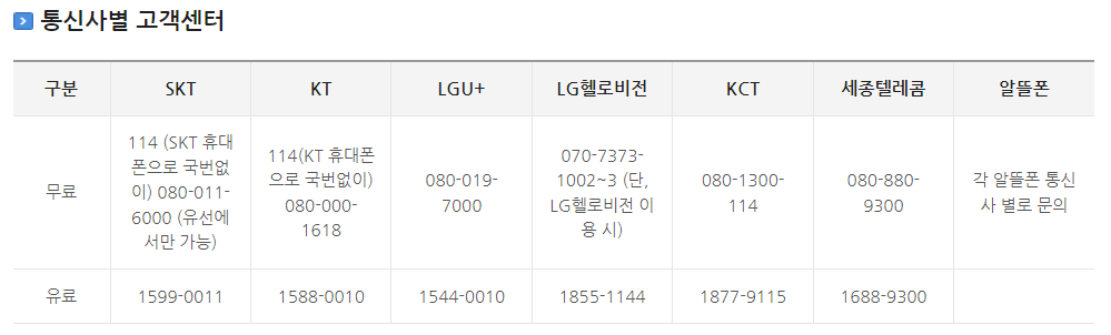 통신사별 고객센터 전화번호입니다. 참고하세요.